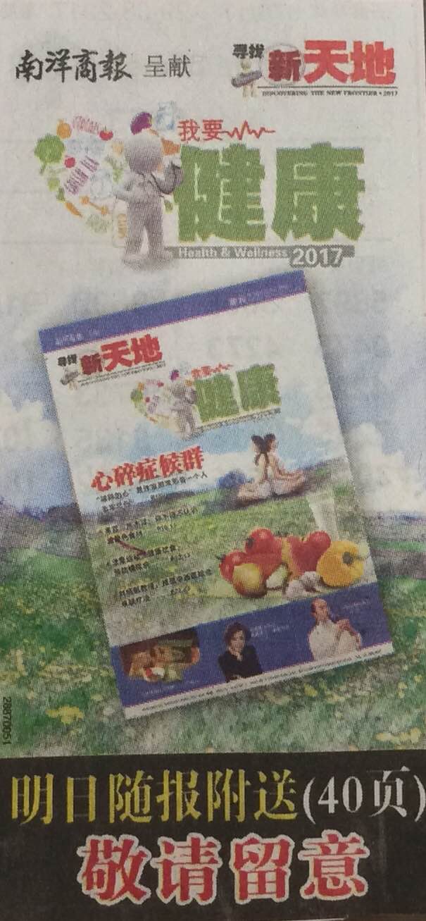 明天 8月31日(星期四)南洋商报将随报赠送"我要健康"杂志,精彩内容包括"五音的疗效,您知多少?",请大家多多关注及分享给亲朋好友们。